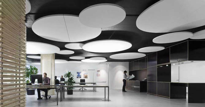 As opposed to acoustic partitioning, which can undermine modern open-plan office interiors and can be exorbitantly expensive, suspended acoustic panels can be strategically placed to hide exposed soffits and other highly reverberant surfaces.