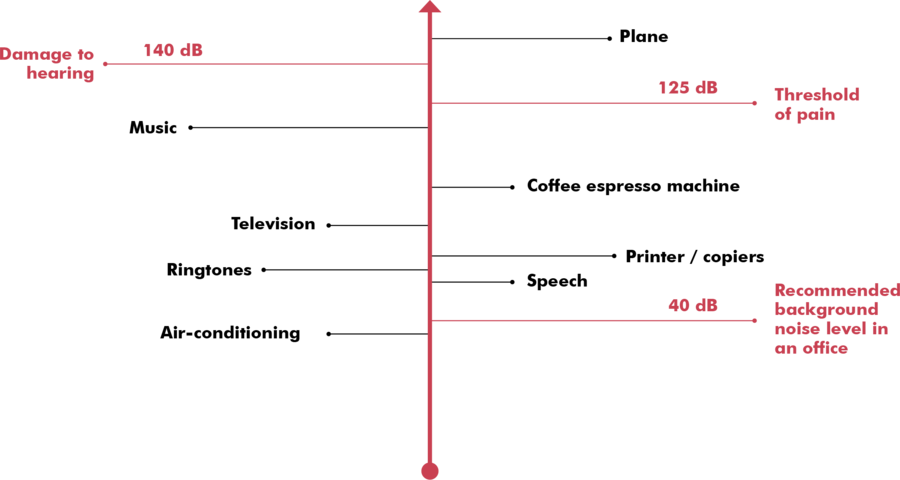 Decibel is a logarithmic unit to express the ratio of sound intensity (volume) and is important as an indicator of the background noise level. Humans can hear sounds between 0 and 140 decibels. The value of decibels has no direct or indirect correlation with the sound frequency.