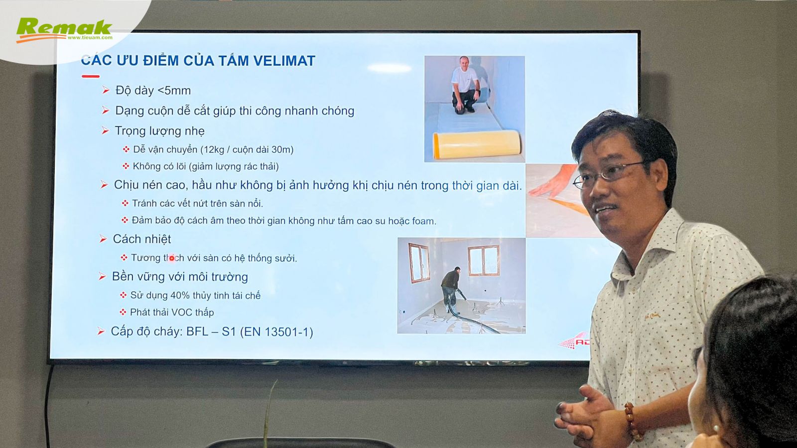 Sáng 18/8, tại văn phòng trụ sở Lại Yên (Hoài Đức, Hà Nội), tập thể nhân viên Remak có buổi học hỏi, giao lưu với ông Huỳnh Nhật An – Trưởng Phòng Kinh doanh ADFORS (thương hiệu trực thuộc Tập đoàn Pháp Saint-Gobain) về 3 dòng sản phẩm: thảm sàn cách âm Velimat®, lưới cốt sợi thủy tinh chống nứt Vertex® Mesh và vải dán tường sợi thủy tinh Novelio® Wallcoverings.