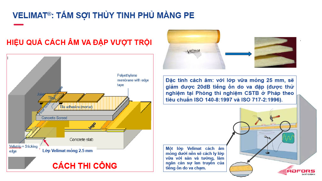 Đáng chú ý, thảm sàn cách âm Velimat® chuyên dùng để lót sàn, chống ồn, giảm rung, cách âm va đập vượt trội và đảm bảo độ cách âm bền bỉ theo tuổi thọ công trình. Đặc tính tiêu âm, cách nhiệt, chống cháy được phát huy tối ưu nhờ lớp đệm làm từ bông thủy tinh. Có khả năng uốn cong, chúng phù hợp nhiều kết cấu – hình dạng bề mặt sàn. Thi công cùng lớp vữa mỏng 25mm, sản phẩm giảm được tới 20dB tiếng ồn do va đập (được thử nghiệm tại Phòng thí nghiệm CSTB ở Pháp theo tiêu chuẩn ISO 140-8:1997 và ISO 717-2:1996). Bên cạnh đó, thảm cũng sở hữu nhiều ưu điểm nổi bật: