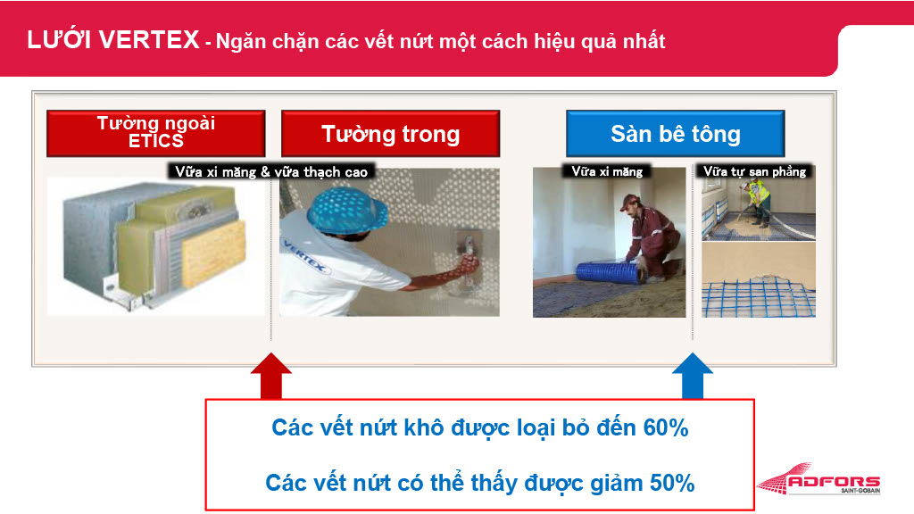Trong khi đó, lớp nền thường dùng vữa hồ mỏng để phủ lên trên nền kết cấu hoặc vật liệu cách nhiệt. Thành phần kết dính gốc xi-măng làm lớp vữa này nhạy cảm với nước và môi trường, đặc biệt trong quá trình đông kết. Chúng ta cần sử dụng vật liệu gia cố để đảm bảo chất lượng tốt của bề mặt lớp nền và không để xảy ra bất kỳ vết nứt nào. Lưới ADFORS Vertex® mang lại giải pháp gia cố lớp vữa nhẹ với hiệu quả cao, ít tốn kém và ưu việt hơn lưới thép hoặc lưới sợi polypropylene. Chúng dễ dàng thi công, không bị gỉ hoặc mục nát, giúp gia tăng độ bền trong tất cả các loại vữa gốc xi-măng.