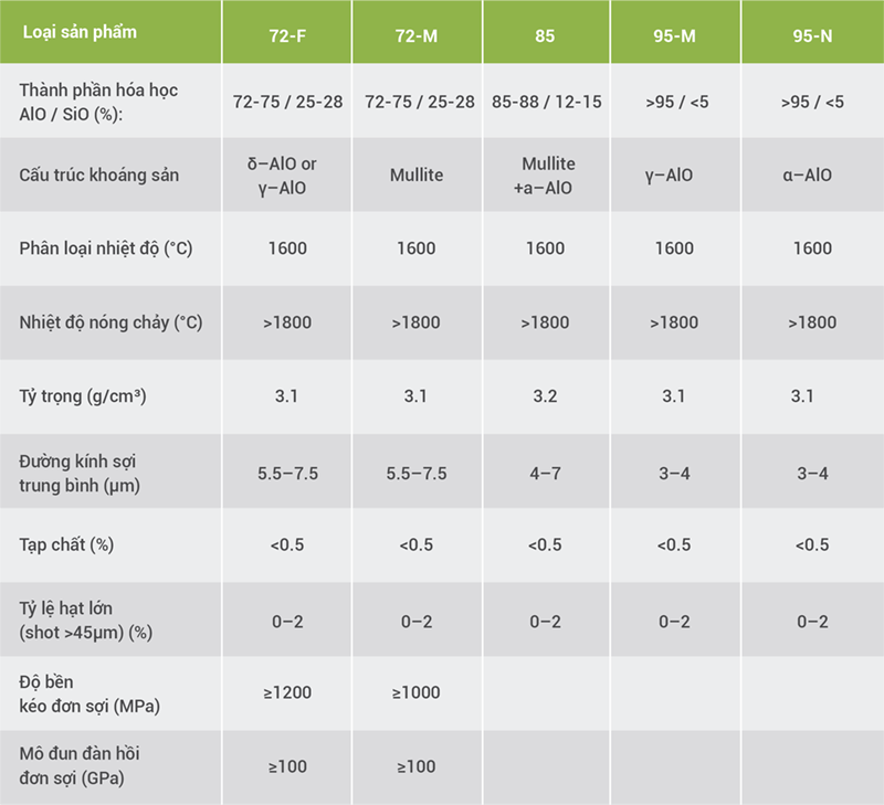 Chúng tôi có 5 dòng sản phẩm chính, được phân biệt bởi tỷ lệ thành phần Oxit nhôm và Oxit Silic, bao gồm: 72-F; 72-M; 85; 95-N; 95-M
