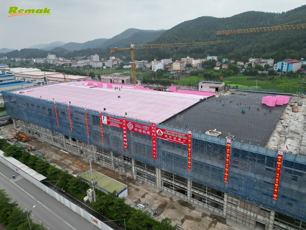Hạng mục cất nóc nhà xưởng do Công ty TNHH Xây dựng Hoa Việt (Huayue Construction Industry Company Ltd.) thi công. Remak® XPS là vật liệu xanh và là thành phần không thể thiếu được trong quá trình xây dựng các công trình xanh. Vì vậy, sản phẩm của Cty CP Xây dựng & Nội thất Remak sản xuất được lựa chọn sử dụng bởi chất lượng vượt trội; khả năng cách nhiệt, cách âm, chống đọng sương, chịu nén tối ưu; giá thành hợp lý. Anh Nguyễn Đình Cường (Công ty TNHH Xây dựng Hoa Việt) – Chỉ huy trưởng tòa C2, Dự án Nhà máy Sản xuất tai nghe, dây kết nối New Wing nhận định: “Xốp XPS của Remak có trọng lượng gọn nhẹ, vận chuyển dễ dàng, thi công nhanh chóng; giúp chúng tôi làm việc rất thuận lợi, đạt hiệu suất cao và chắc chắn cũng sẽ góp phần nâng cao tuổi thọ bền bỉ cho cả công trình nhà máy!”.