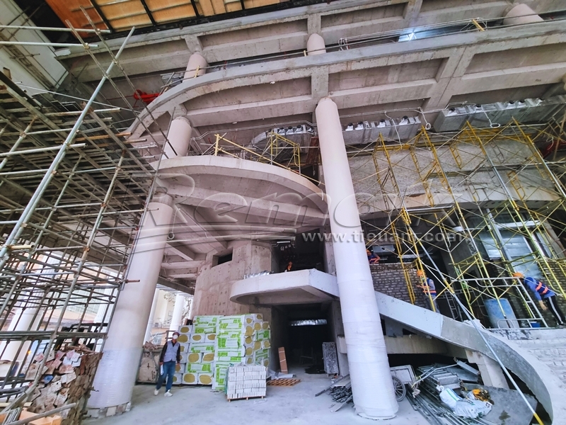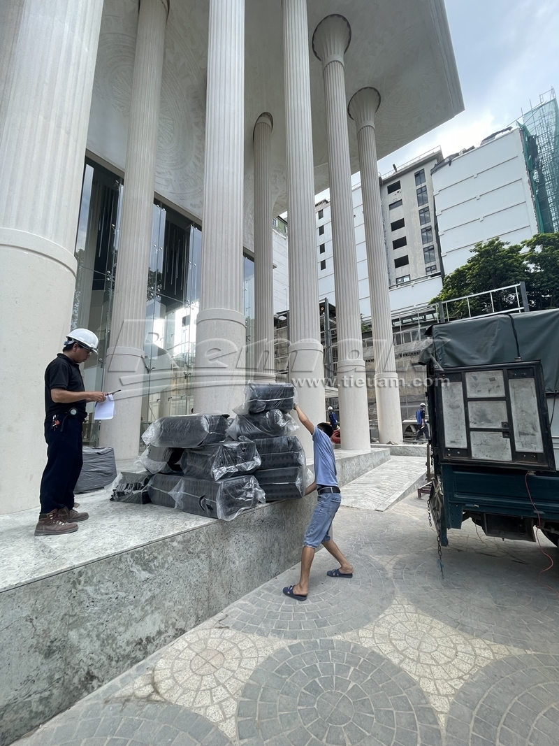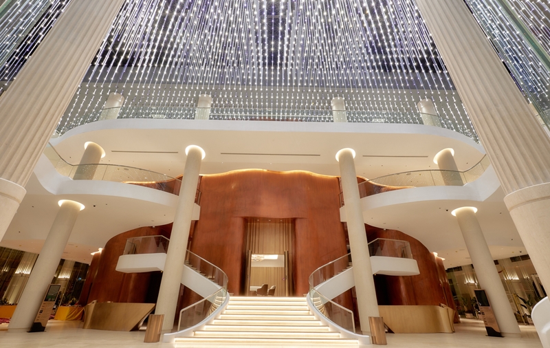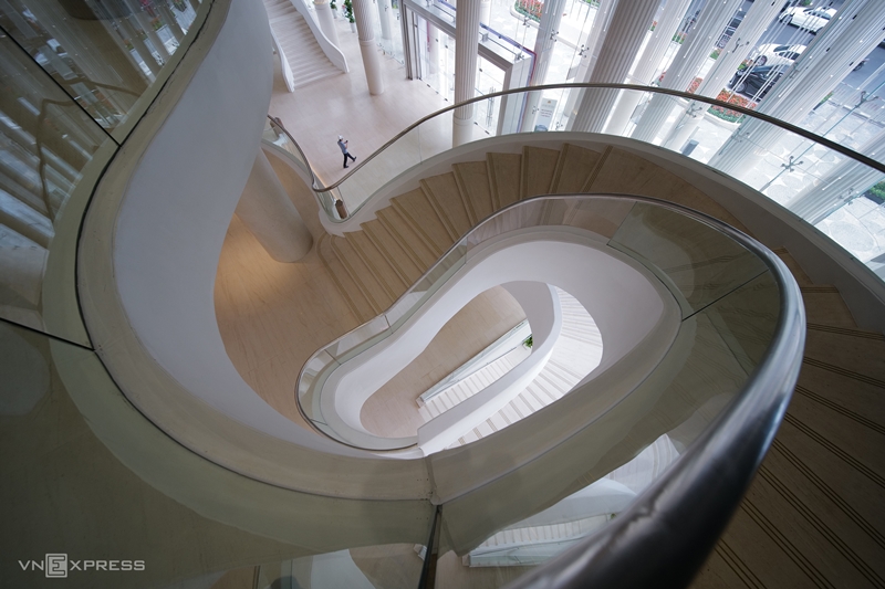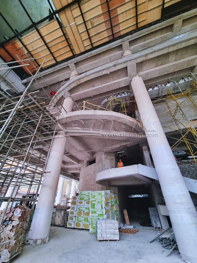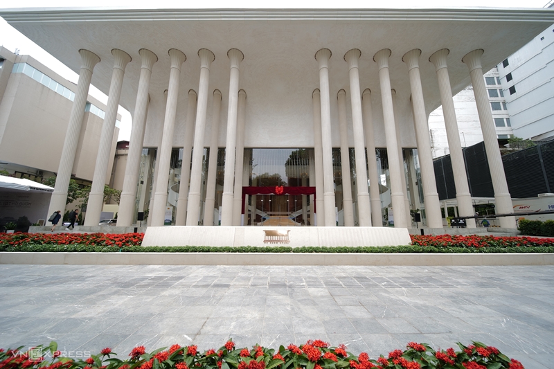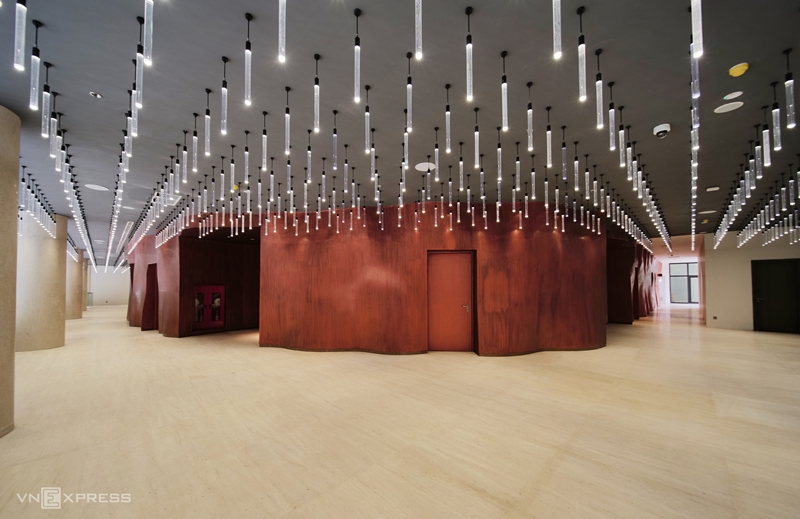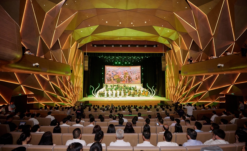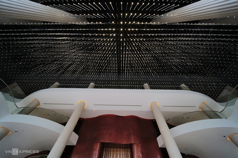Đáng chú ý, 52 cột đá bên trong và bên ngoài công trình có chiều cao 18m, được đưa về từ Tây Ban Nha. Sảnh chính của nhà hát lấy ý tưởng bầu trời đầy sao đêm, với 3.000 bóng đèn LED thả xuống từ trần nhà. Trên tường và trần có các họa tiết như Trống đồng Đông Sơn, hoa văn chim hạc, nhạc cụ dân tộc, Rùa Vàng trao kiếm…
