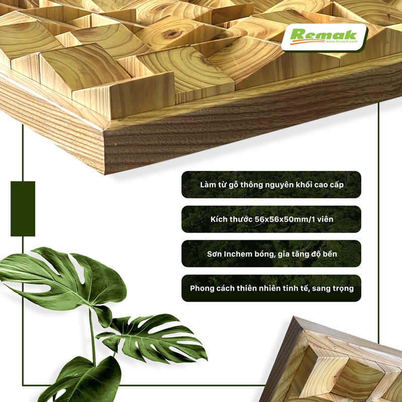 Mỗi viên gỗ thông vát chéo đầu có kích thước 56x56x50mm; vân gỗ mềm mại, độc đáo; phản xạ và khuyếch tán được sóng âm thanh một cách tùy ý (tần số phản xạ: 500–8000Hz). Tranh gồm 2 phiên bản: đã hoàn thiện và combo tự chọn để khách tự thi công tại nhà. Chúng sở hữu công năng làm đẹp; cải thiện chất lượng âm thanh – độ rõ của lời nói tốt hơn; giảm thiểu tiếng ồn ở những khu vực công cộng, phòng hội nghị; chuyên dụng tán âm, tạo ra trải nghiệm âm thanh sống động, cân bằng...