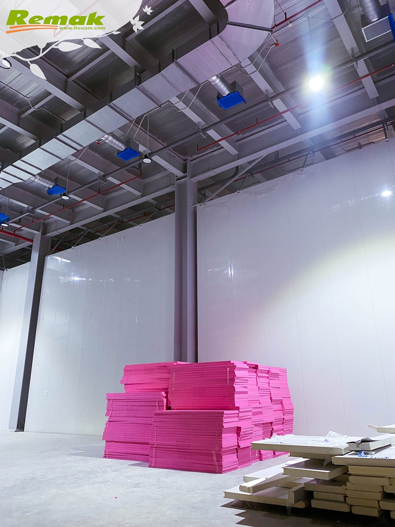 Sàn kho lạnh thường được thi công cách mặt đất khoảng 30-100cm để nâng cao hiệu quả giữ nhiệt. Quy trình đạt chuẩn gồm 8 bước thi công: 1. Nền đất tự nhiên. 2. Lớp bê-tông dày. 3. Lớp chống thấm. 4. Màng nilon. 5. Tấm xốp Remak® XPS. 6. Lưới thép. 7. Lớp bê-tông hoàn thiện. 8. Sơn kháng khuẩn bề mặt.