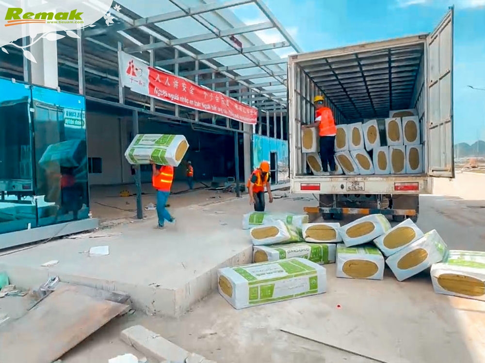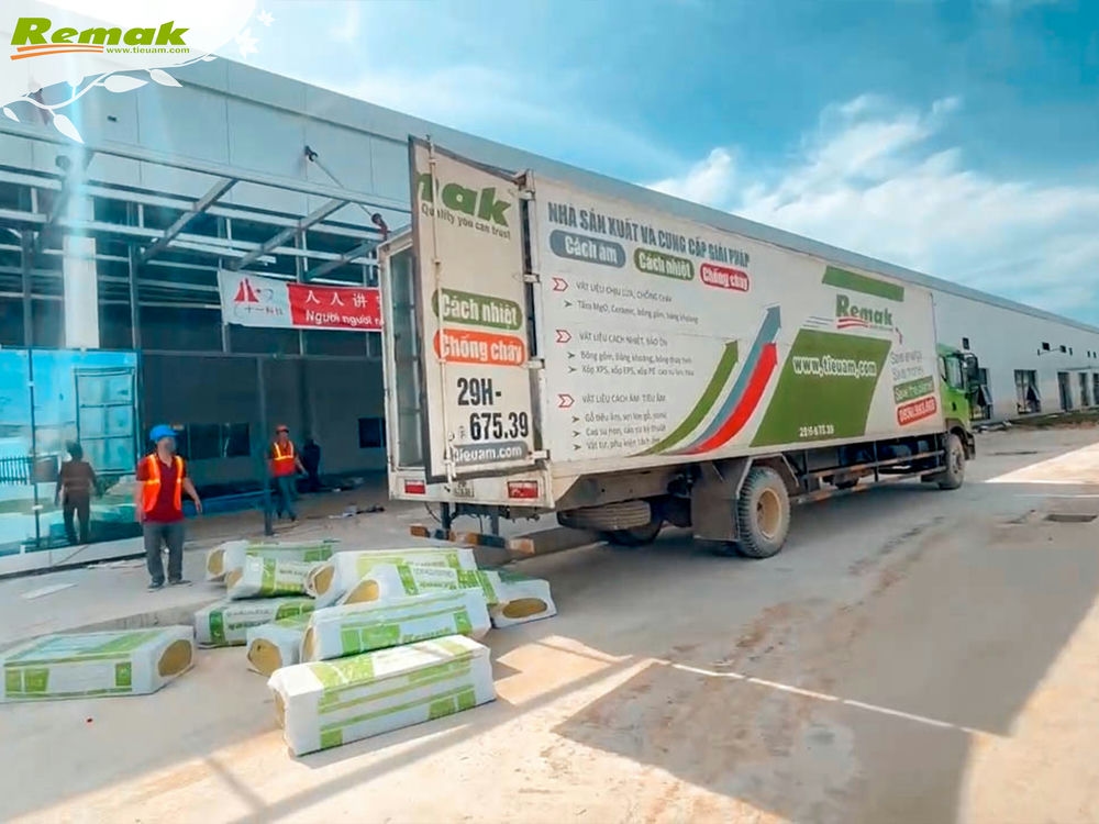 Nhà thầu là Công ty TNHH MTV Thương mại và xây dựng Nam Tuấn vừa tiếp nhận số lượng lớn bông khoáng Remak® Rock wool từ Remak để thi công vách cách âm - cách nhiệt - chống cháy cho dự án lớn của Thái Lan tại KCN Hoàng Mai – Nghệ An.
