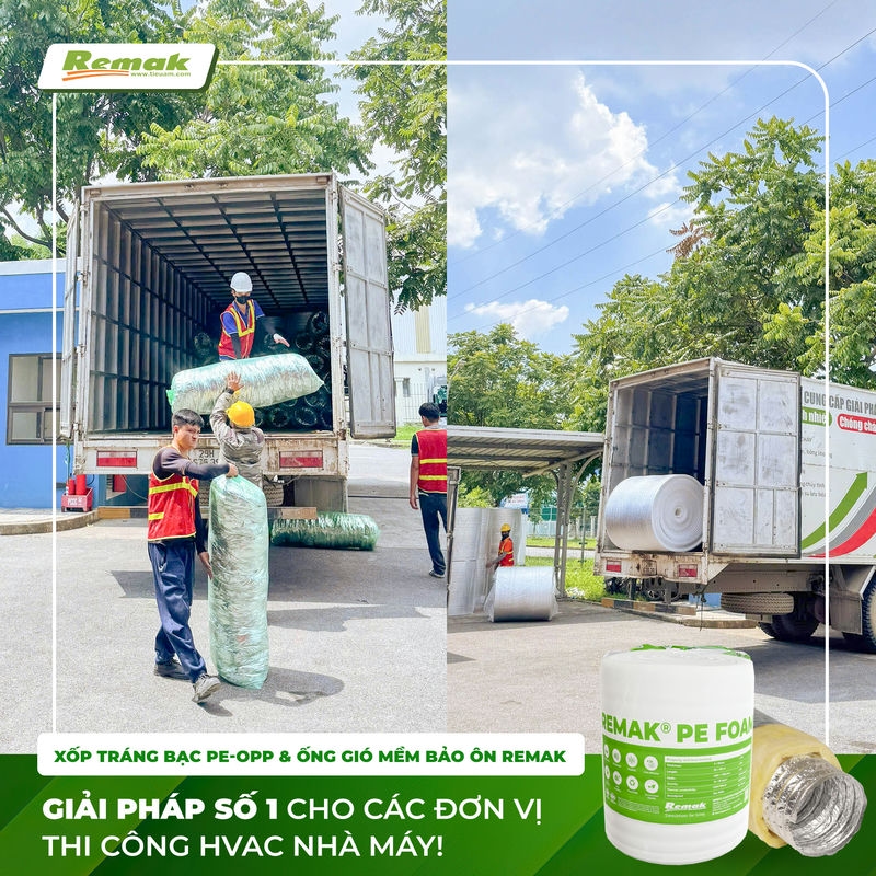 Remak vừa hoàn tất cung cấp xốp PE mặt bạc và ống gió mềm bảo ôn cho một khách hàng lâu năm - chuyên thi công hệ thống thông gió cho các công trình công nghiệp quy mô lớn trên khắp các tỉnh thành Việt Nam.