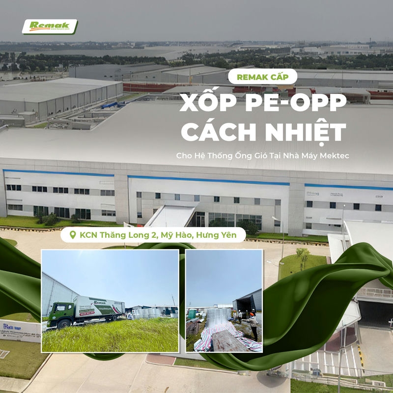 Với uy tín lâu năm trên thị trường vật liệu cách âm cách nhiệt, bảo ôn, Remak vui mừng và vinh dự khi được Công ty CP xây lắp và thương mại Trường Lộc lựa chọn là nhà cung cấp PE-OPP cho hạng mục bảo ôn cách nhiệt hệ thống đường ống gió tại Nhà máy Metek Hưng Yên, thuộc KCN Thăng Long. Metek được đánh giá là một trong công ty hàng đầu Việt Nam cung cấp đa dạng các thiết bị cơ điện, công nghiệp và tự động hoá.
