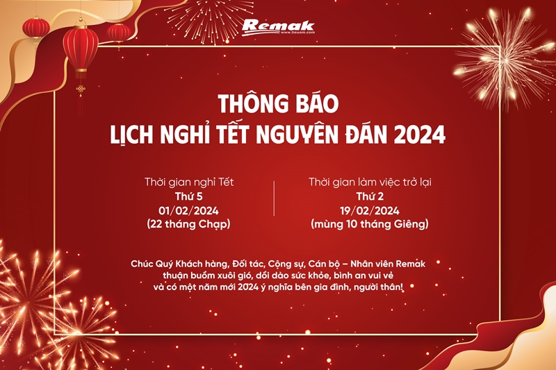 Công ty Cổ phần Xây dựng & Nội thất Remak sẽ nghỉ Tết Nguyên đán 2024 trong 18 ngày: từ thứ năm 1/2/2024 (22/12 âl) đến chủ nhật 18/2/2024 (9/1 âl).