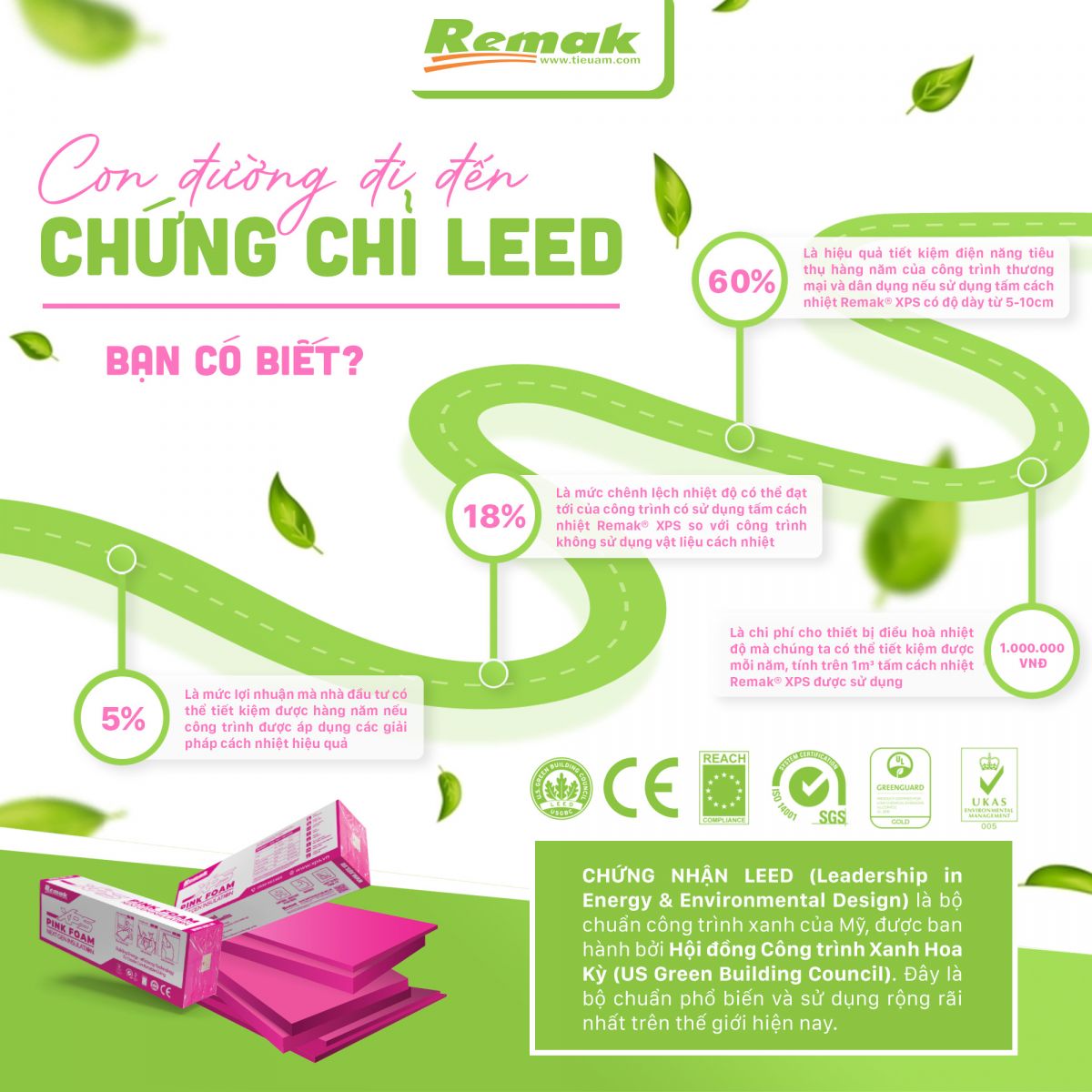 Bằng cách giảm thiểu sự truyền nhiệt qua vách ngăn, vật liệu cách nhiệt có thể hạ mức tiêu thụ năng lượng của các hệ thống điều hòa không khí và làm mát; giảm thiểu tác động của khí thải carbon. Vì vậy, Remak® XPS trở thành thành phần quan trọng cấu thành nên các Công trình Xanh và đạt chuẩn LEED.