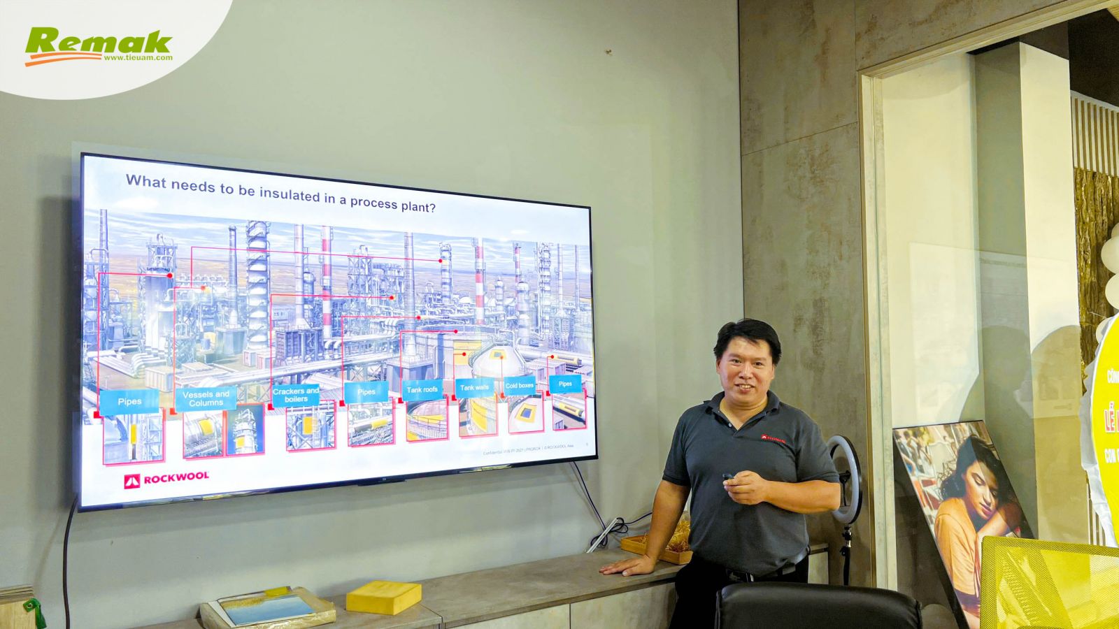 Chiều 31/8, Chuyên viên Văn phòng đại diện tại Việt Nam ROCKWOOL (Thailand) Limited Nguyễn Tuấn Anh thực hiện buổi đào tạo – chia sẻ lý thú về các dòng sản phẩm bông khoáng ROCKWOOL đi kèm ứng dụng đa dạng; đối sánh trực quan đặc tính cách nhiệt, cách âm, chống cháy nổi trội so với những vật liệu cùng loại khác; kỹ thuật thi công; giải pháp cho toàn bộ lớp vỏ tòa nhà, các ngành công nghiệp nặng cũng như các công trình dân dụng, thương mại... v.v...