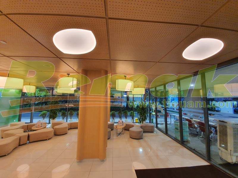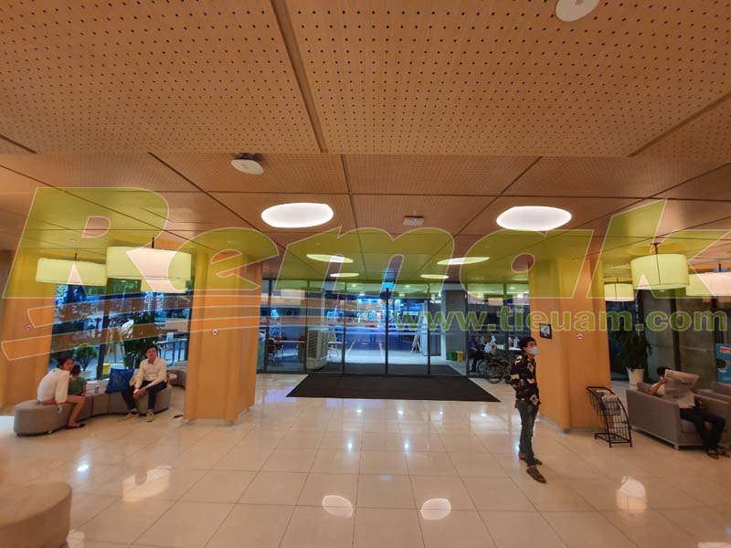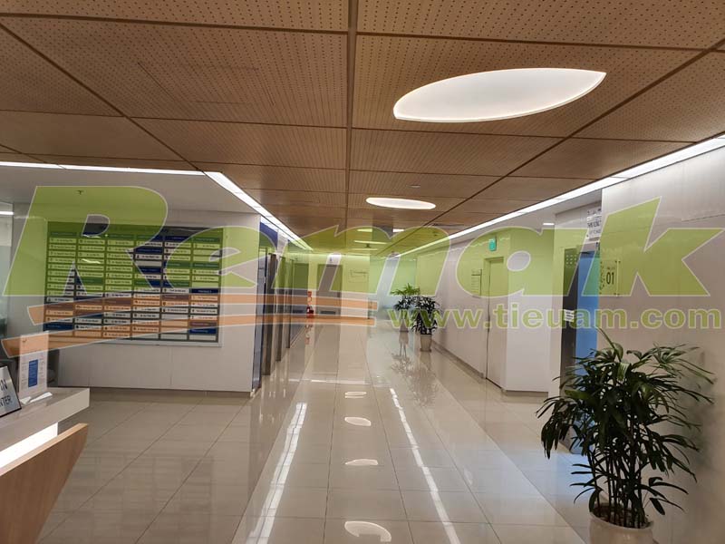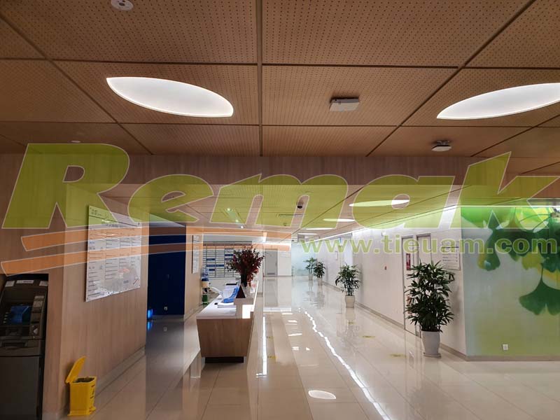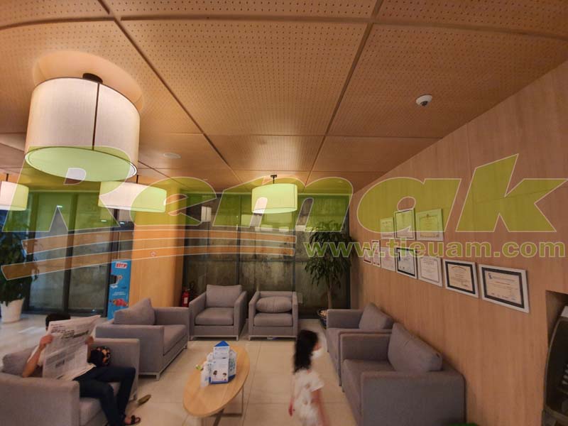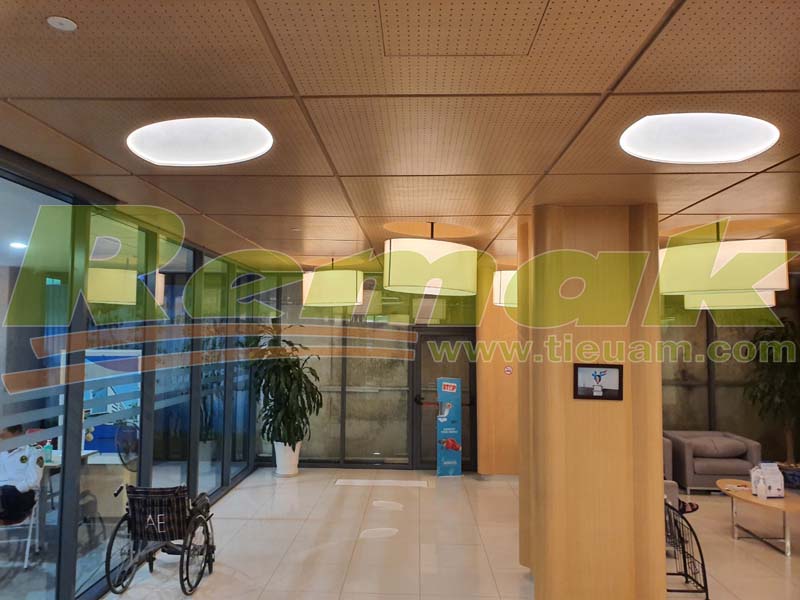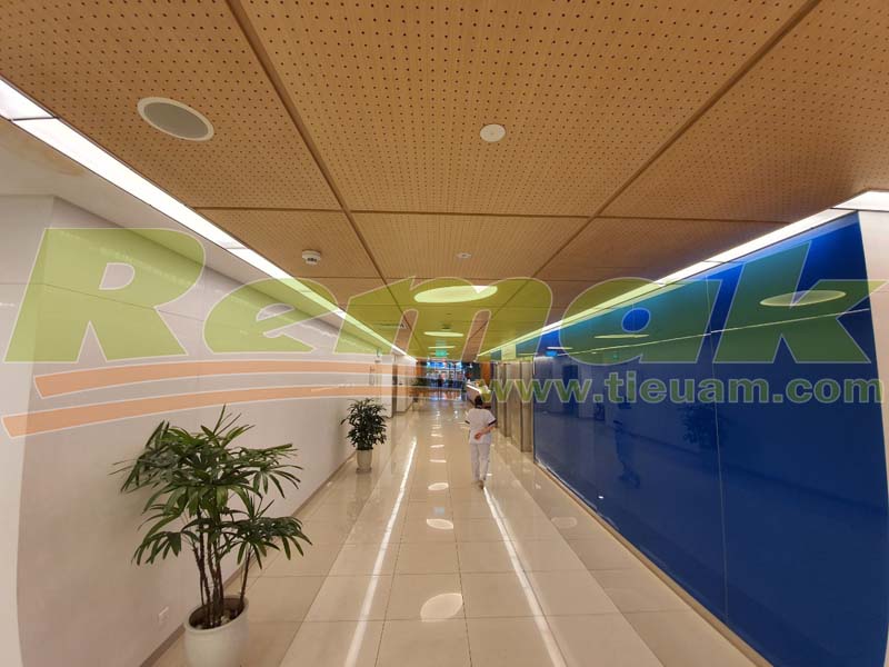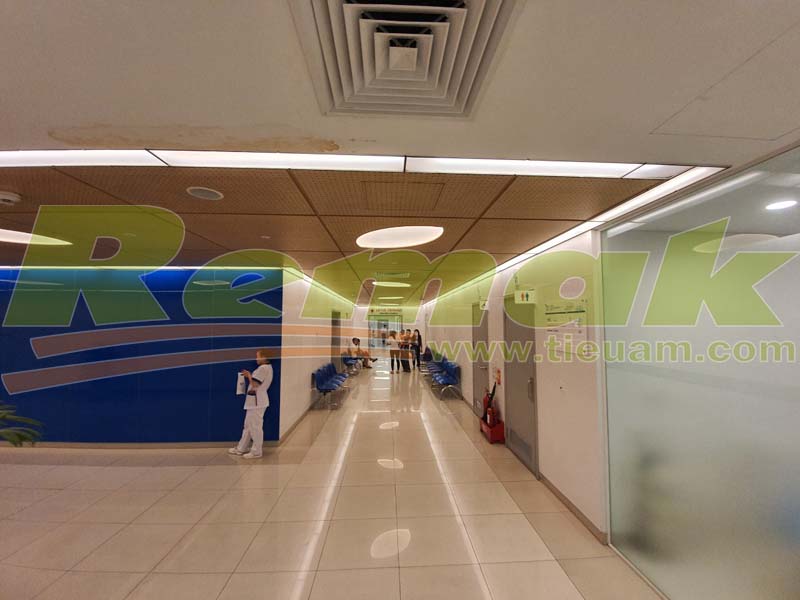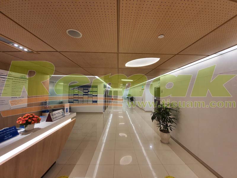 Sau khi khảo sát tình hình thực tế, các kỹ sư, kiến trúc sư của Remak đã lên phương án thiết kế lại trần nhà, sử dụng gỗ tiêu âm đục lỗ trang trí, vừa mang lại không gian ấm cúng, nhẹ nhàng cho bệnh viện vừa tạo ra hiệu suất âm thanh tuyệt vời, giảm tiếng ồn , tiếng vang vọng khó chịu, giúp bệnh nhân và người nhà thoải mái hơn khi sử dụng các dịch vụ tại đây.