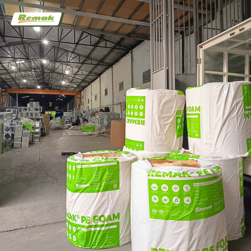 Trong các công trình điều hòa trung tâm (HVAC), tiến độ thi công luôn là một trong những yếu tố quan trọng nhất quyết định hiệu quả vận hành và bàn giao dự án. Đặc biệt đối với hệ thống ống gió, thời gian sản xuất – bọc bảo ôn – lắp đặt có thể kéo dài nếu sử dụng phương pháp thủ công truyền thống như quét keo, dán bạc, hoặc xử lý ghép nối nhiều lớp vật liệu. Chính vì vậy, các đơn vị cơ điện (M&E), nhà thầu HVAC và xưởng sản xuất ống gió hiện đang có xu hướng chuyển sang sử dụng cuộn xốp Remak® PE foam mặt bạc – mặt keo dán sẵn, nhằm rút ngắn thời gian thi công, đồng thời tăng độ bền và tính thẩm mỹ của hệ thống.