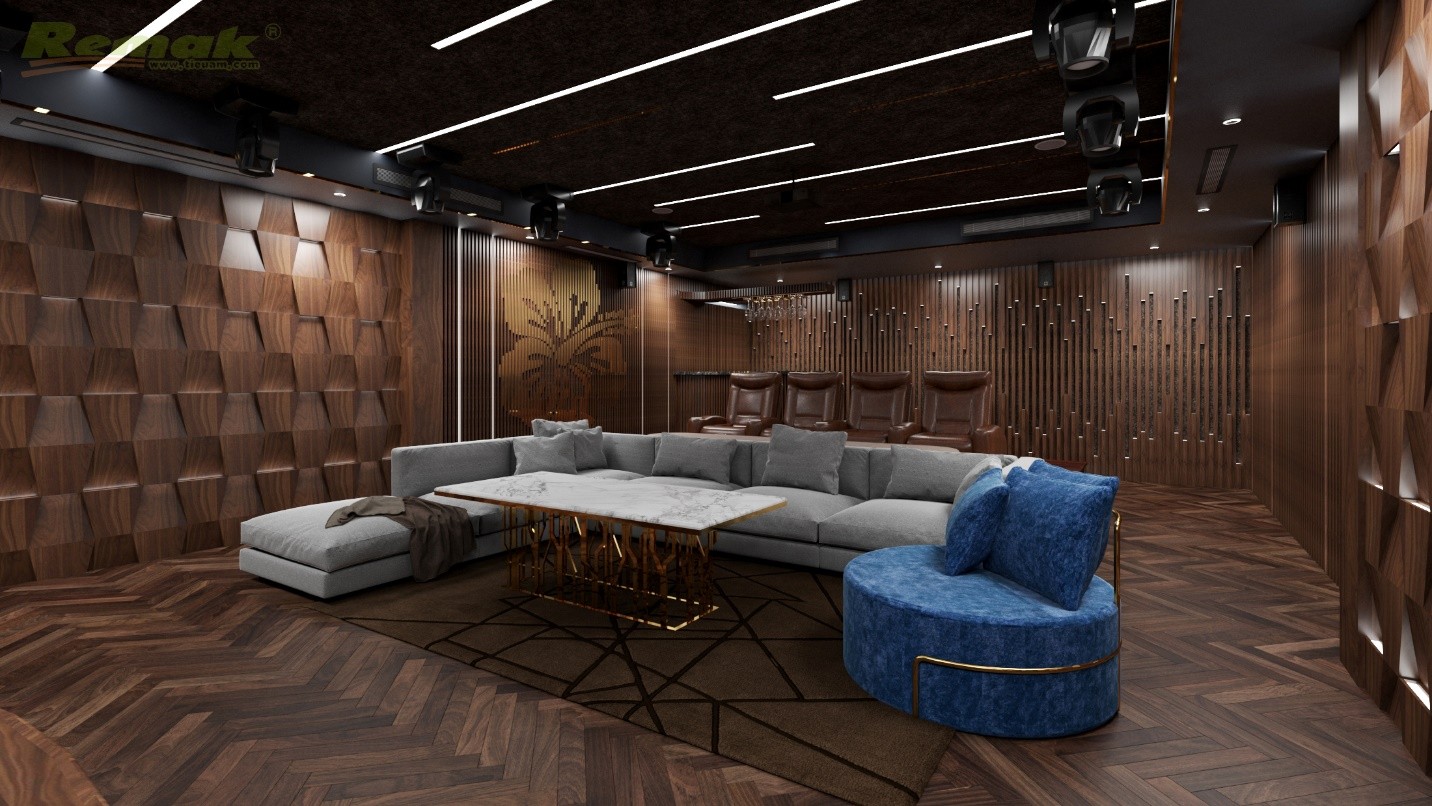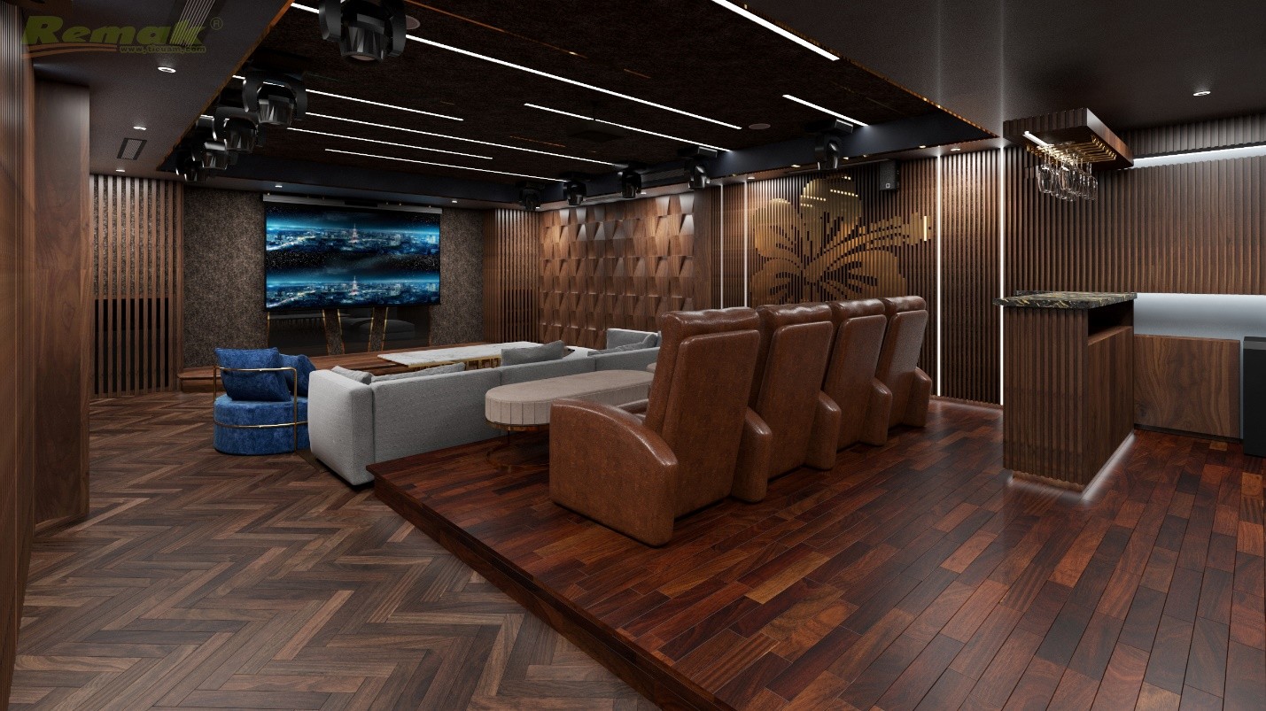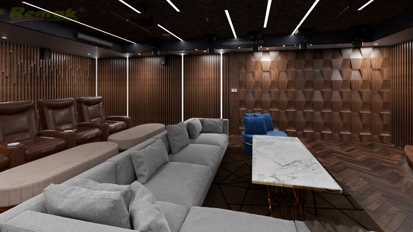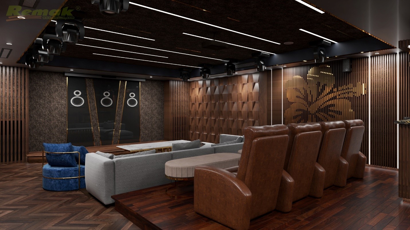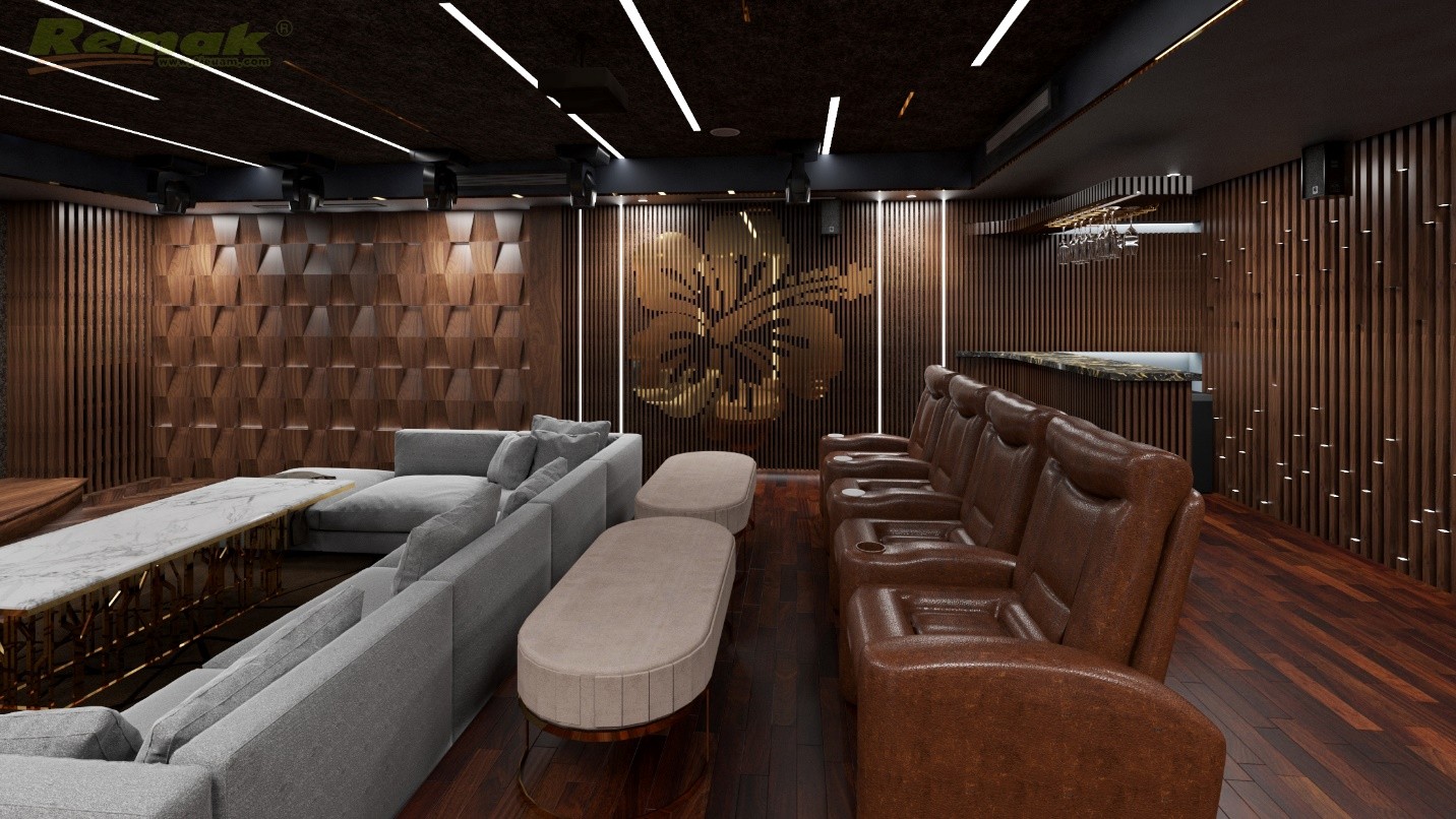 Với yêu cầu thiết kế phòng giải trí đa năng chuyên dụng vừa hiện đại, sang trọng, vừa đáp ứng đầy đủ các tiêu chuẩn âm học, các kiến trúc sư và chuyên gia âm thanh của Remak đã tiến hành khảo sát, đo đạc thực tế. Sau khi xem xét kỹ càng, chúng tôi thấy rằng vì là phòng giải trí đa đăng nên sẽ có nhiều hệ thiết bị âm thanh hình ảnh được sử dụng đồng thời; bao gồm cả hệ thống Karaoke, hệ thống âm thanh trình chiếu. Do đó công năng phòng phải được thiết kế sao cho vừa có thể xem phim thoải mái với chất lượng cao, nhưng khi cần cũng có thể là một không gian mà gia chủ có thể cùng bạn bè tụ họp hát hò gần gũi và ấp áp.