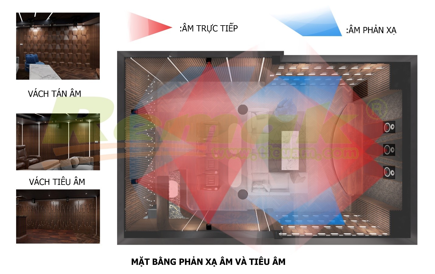 - Tường: là nơi có nhiều điểm phản xạ, cần được cách âm bằng lớp cách âm chuyên dụng, trang trí bên ngoài bằng vật liệu gỗ tiêu âm.