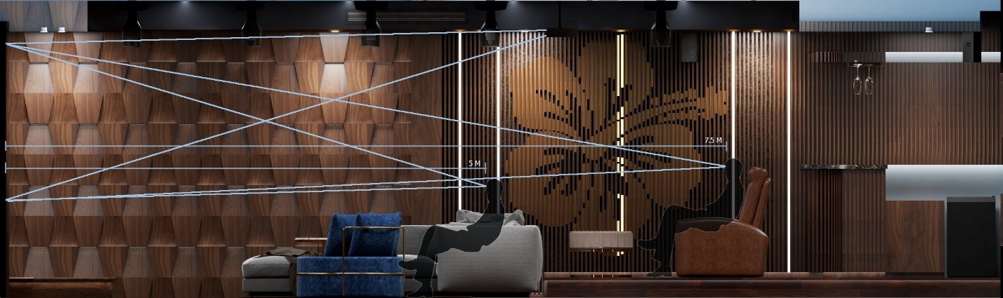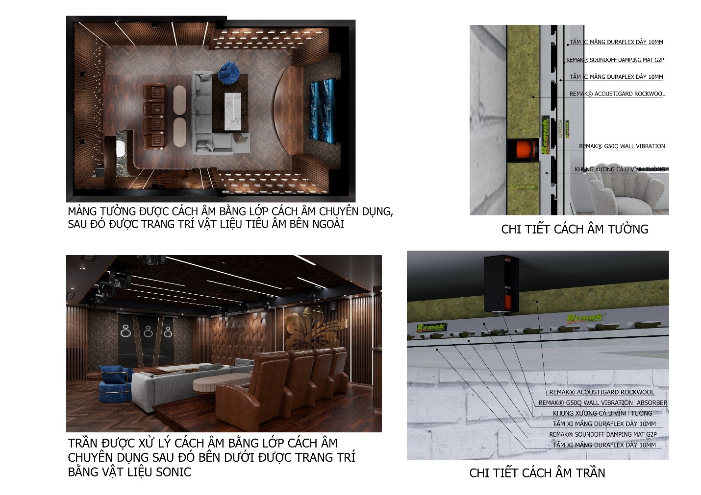- Nhiệm vụ thiết kế: Lên phương án thiết kế và các giải pháp tiêu âm, cách âm tiêu chuẩn của một phòng giải trí chuyên dụng, đáp ứng được nhu cầu giải trí về âm thanh, hình ảnh, đồng thời phải đảm bảo được yêu cầu về mặt thẩm mỹ, tạo ra không gian sang trọng, hiện đại và thoải mái cho người trải nghiệm.