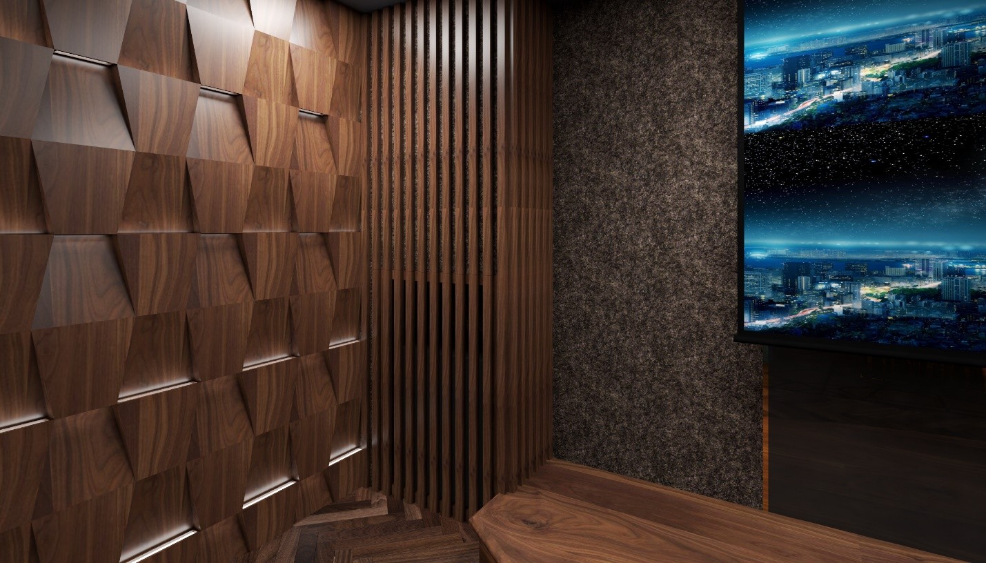 Vách hậu được kết hợp giữa nan gỗ và tấm tiêu âm sonic, đảm bảo âm thanh không bị vang dội lại từ phía sau.