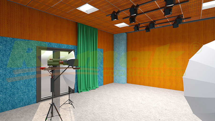 - Trần: Do đặc thù trần có nhiều đường ống, thiết bị chiếu sáng, đèn Led quay phim chiếu sáng, ray treo đèn chạy nên việc xử lý tiêu âm thông thường lên trần không đạt hiệu quả về mặt thẩm mỹ. Chúng tôi đưa ra 2 giải pháp. Do tăng cường diện tích tiêu âm bề mặt nên phần trần có thể không cần thiết phải xử lý tiêu âm phức tạp. Phương án đầu tiên là trần bê tông để thô sơn đen để tránh hắt sáng. Giải pháp thứ 2 là làm một hệ trần cách âm hoàn toàn độc lập phía trên toàn bộ thiết bị như đường ống thông gió, thiết bị PCCC, đèn, ray treo đèn, điện v.v..