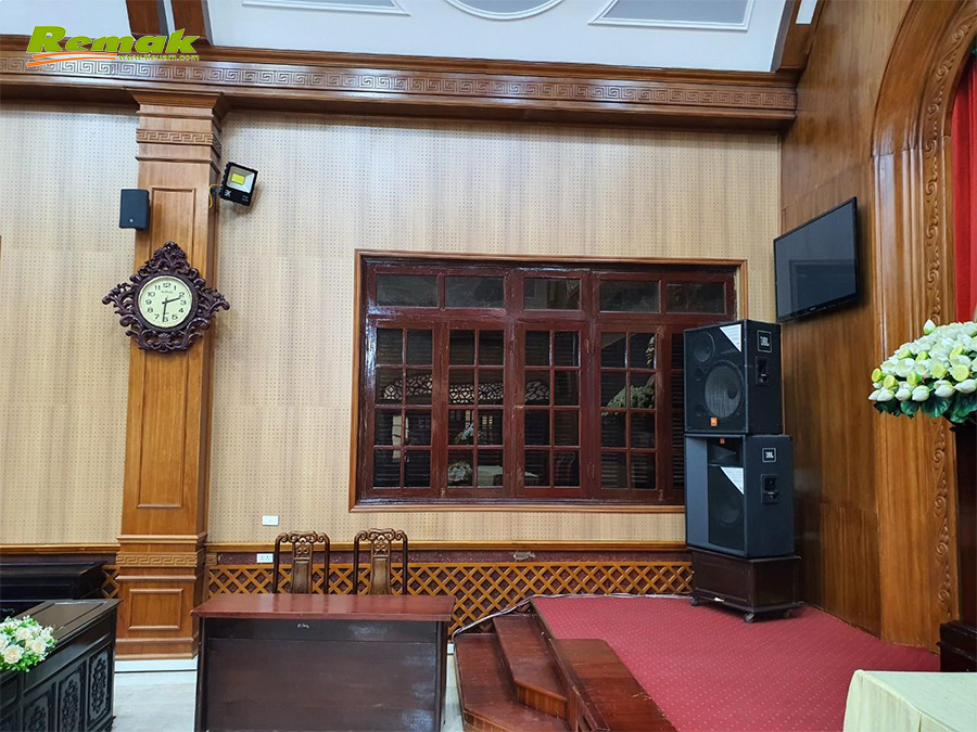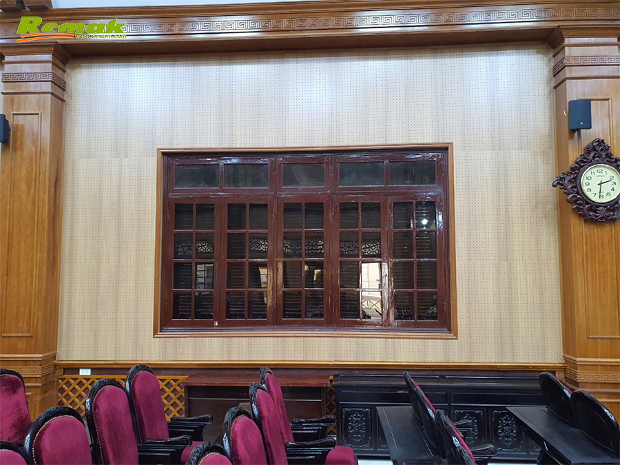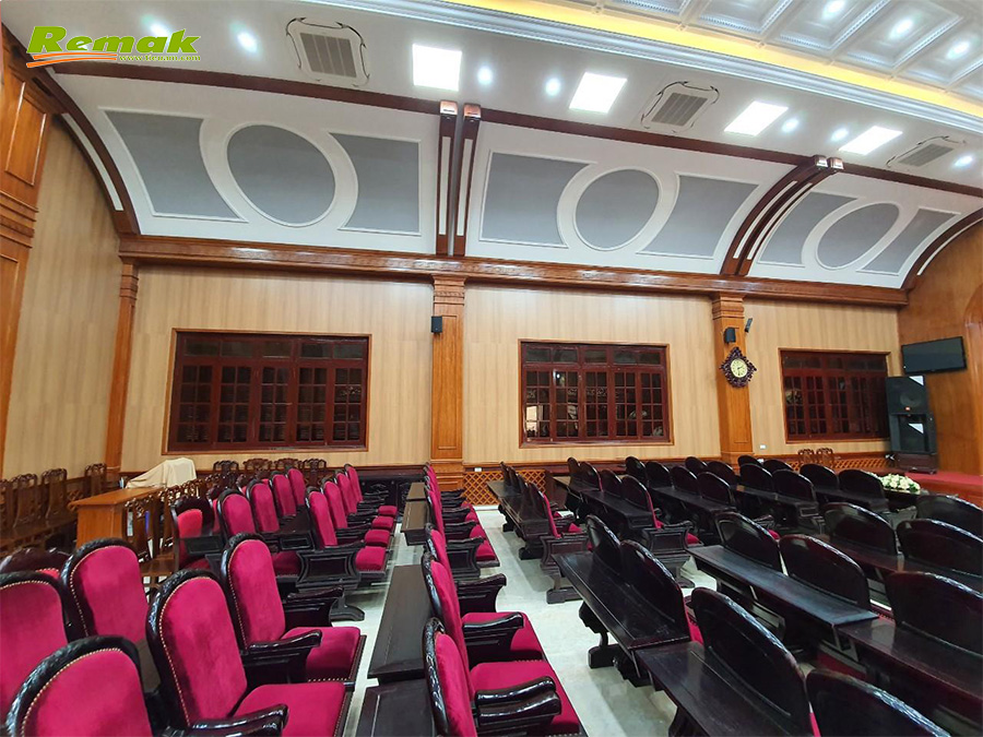Hội trường UBNN Huyện Hà Nam với diện tích vừa phải được thiết kế nhã nhặn và sang trọng, với sự kết hợp của Gỗ tiêu âm đục lỗ Remak® nhằm mục đích tiêu âm và trang âm trong không gian hội trường.