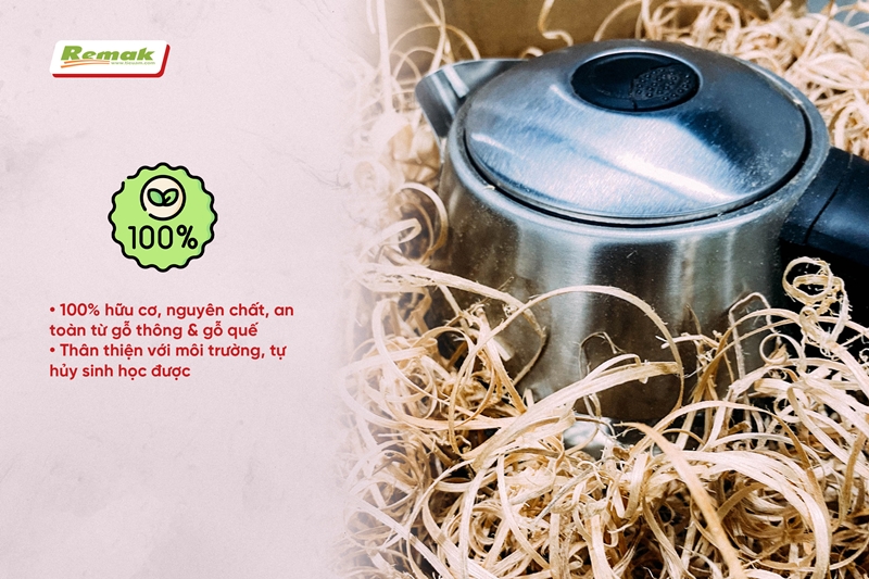 Woodlen™ Remak có nguồn gốc 100% hữu cơ, nguyên chất, an toàn, được bào sợi từ gỗ thông & gỗ quế trồng rừng công nghiệp. Kết cấu nhẹ xốp, phồng tơi, bồng bềnh nên rất dôi dư. Thân thiện với môi trường, tự hủy sinh học được (trở thành chất bón dinh dưỡng cho đất).