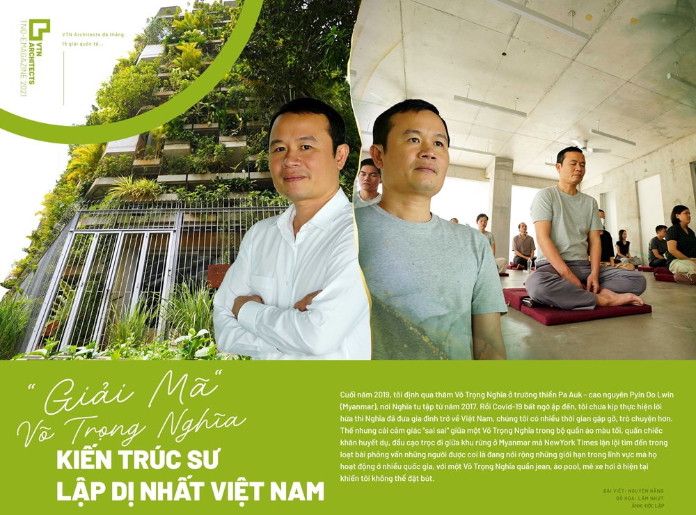 Trong khi đó, Võ Trọng Nghĩa là kiến trúc sư kiệt xuất có danh tiếng và sức ảnh hưởng vươn tầm thế giới với khoảng 150 giải thưởng danh giá ở lĩnh vực kiến trúc. 2021 là một trong nhiều năm thành công của VTN Architects khi đã giành chiến thắng 20 giải thưởng quốc tế uy tín, bao gồm “Văn phòng kiến trúc của năm” tại giải thưởng Architecture MasterPrize (mỗi năm chỉ duy nhất 1 công ty trên thế giới được lựa chọn), Dezeen, Wallpaper Design, World Architecture (WA), LOOP Design… v.v… Võ Trọng Nghĩa từng nhận lời mời thỉnh giảng ở Đại học Hong Kong (Trung Quốc), Đại học Thanh Hoa (Trung Quốc), Đại học Columbia (Mỹ); nói chuyện tại Festival Kiến trúc Thế giới (World Architecture Festival)… Năm 2020, Nhà xuất bản Mỹ thuật Hồ Nam, Trung Quốc xuất bản cuốn sách có tựa đề "Tính thẩm mỹ trong thiết kế kiến trúc của Võ Trọng Nghĩa – Tiếp cận vô hạn tới thiên nhiên" và được độc giả Hoa ngữ đón nhận nhiệt thành.